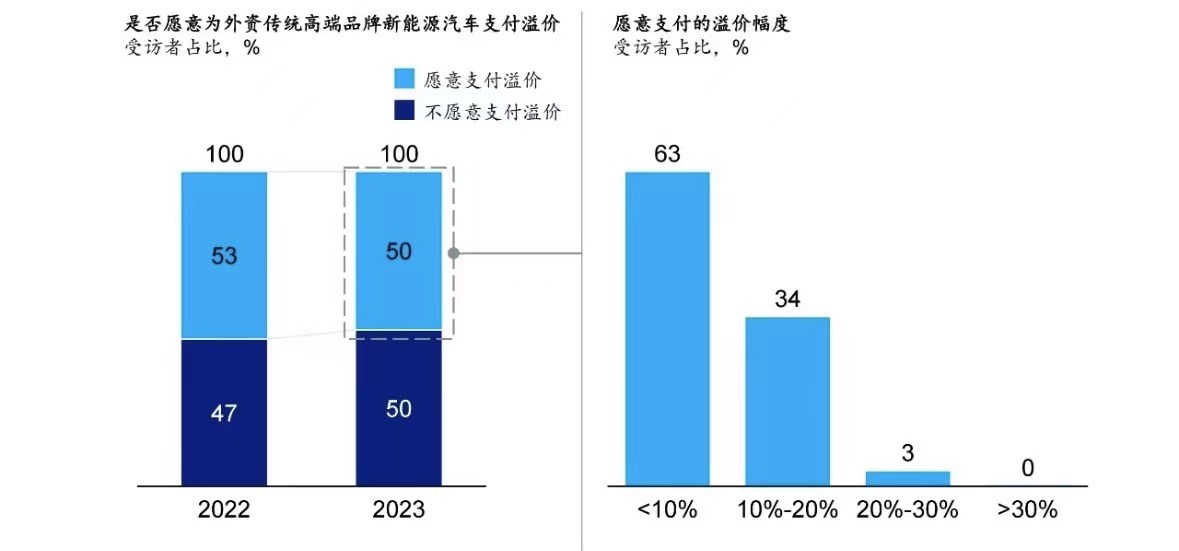 在《2024麥肯錫中國汽車消費者洞察》中顯示,50%的受訪者不愿意為外資品牌支付溢價,相比于無形的品牌力,消費者現(xiàn)在更愛實在的技術(shù)與配置。