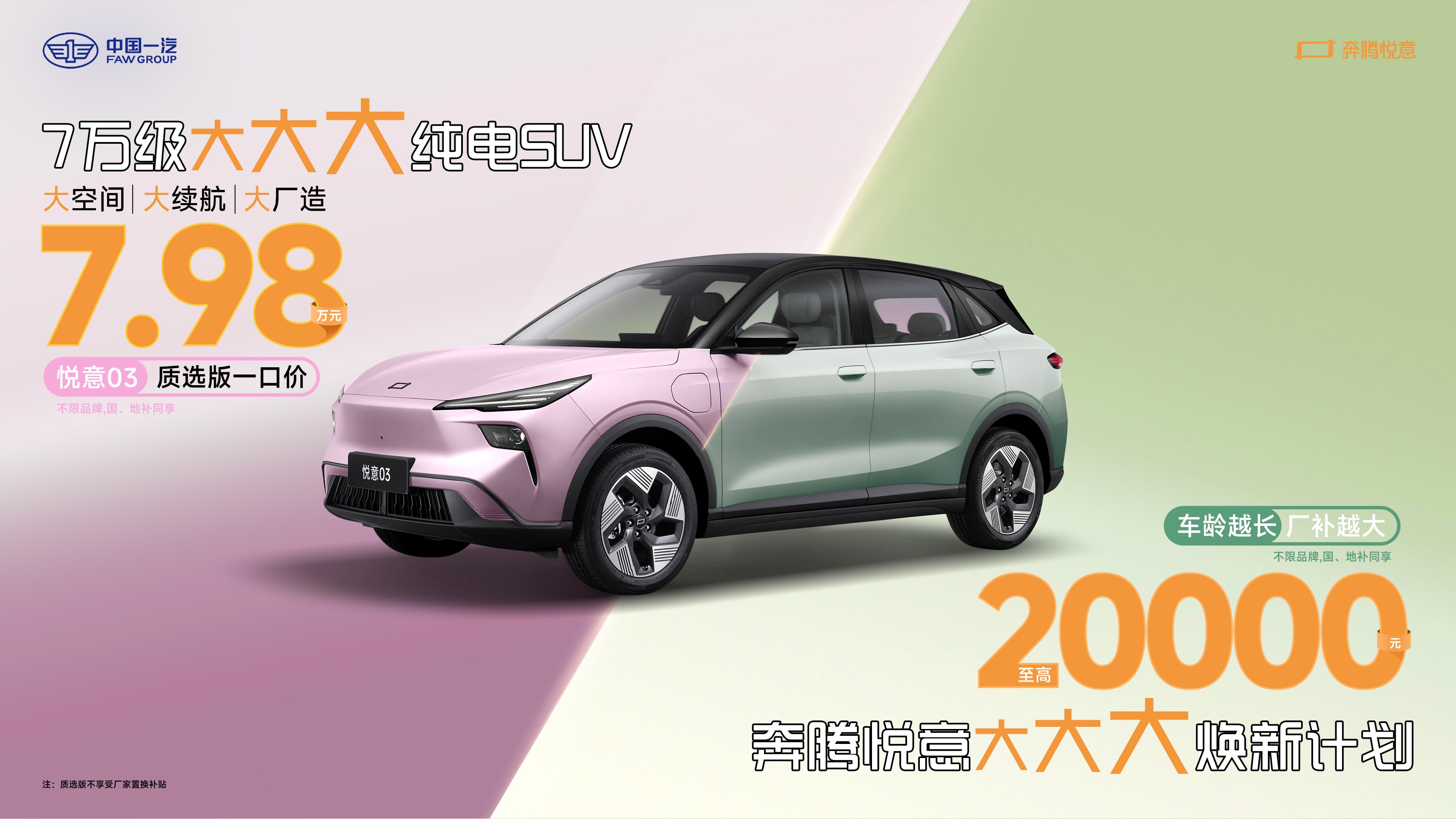 令人驚喜的是,剛剛上市的悅意03,即日起重磅加推全新版型“質(zhì)選版”,一口價僅售7.98萬元,原有車型的煥新廠補還將拉高至最高20000元,同時還可同享國、地補,堪稱A級SUV質(zhì)價比新卷王。再加持大空間、大續(xù)航和大廠造三大越級亮點,悅意03這一“7萬級大大大純電SUV”,必將成為奔騰悅意展臺的又一亮點。