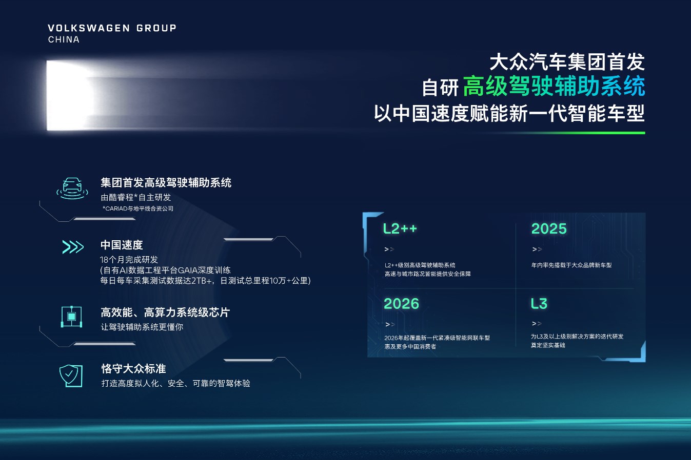 中國速度,本土研發(fā)——由集團(tuán)中國團(tuán)隊研發(fā),專為中國復(fù)雜多樣的路況量身打造的高級駕駛輔助系統(tǒng)首次亮相。依托高效能、高算力的系統(tǒng)級芯片(SoC),經(jīng)由酷睿程自有AI數(shù)據(jù)工程平臺GAIA充分訓(xùn)練,該系統(tǒng)可最高實(shí)現(xiàn)L2++級別高級駕駛輔助功能,支持用戶快速應(yīng)對各種復(fù)雜路況。該系統(tǒng)將在今年率先搭載于一款面向中國市場的大眾品牌新車型,并計劃于2026年進(jìn)一步應(yīng)用到基于CMP平臺開發(fā)、搭載CEA電子電氣架構(gòu)(China Electronic Architecture)的全新智能網(wǎng)聯(lián)車型,滿足更多主流緊湊型細(xì)分市場消費(fèi)者的需求。