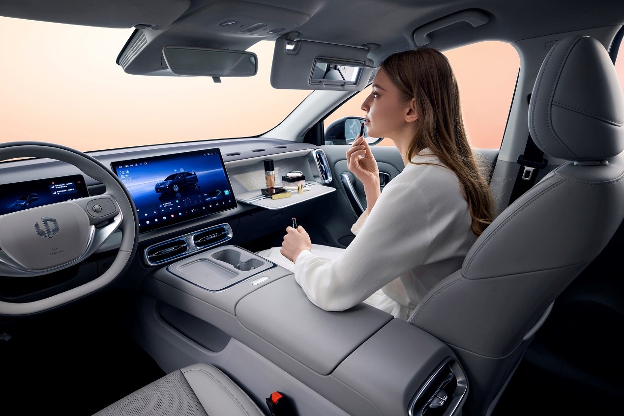 零跑B01沿用了B系列首創(chuàng)的"百變副駕空間"設(shè)計(jì)——通過6個(gè)魔術(shù)拓展孔與1個(gè)矩形凹槽,可自由組合折疊桌板、手機(jī)支架、儲(chǔ)物盒、水杯架、掛飾等配件,適配辦公、娛樂、收納等多場(chǎng)景需求。