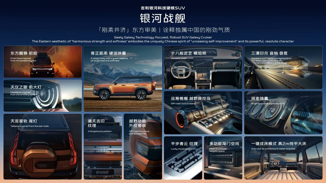 發(fā)布會上,吉利智能安全科技的集大成者——銀河戰(zhàn)艦迎來全球首發(fā)。銀河戰(zhàn)艦在設(shè)計上不僅展現(xiàn)了“剛?cè)岵钡臇|方審美,更詮釋了獨屬于中國人“自強不息”的剛勁氣質(zhì)。形似“渾天儀”的前大燈、勾勒“天宮星軌”的尾燈,靈感來自“游艇操縱桿”的越野操控島等設(shè)計等,均展現(xiàn)了吉利銀河“漣漪美學(xué)”在智電時代的硬派表達。