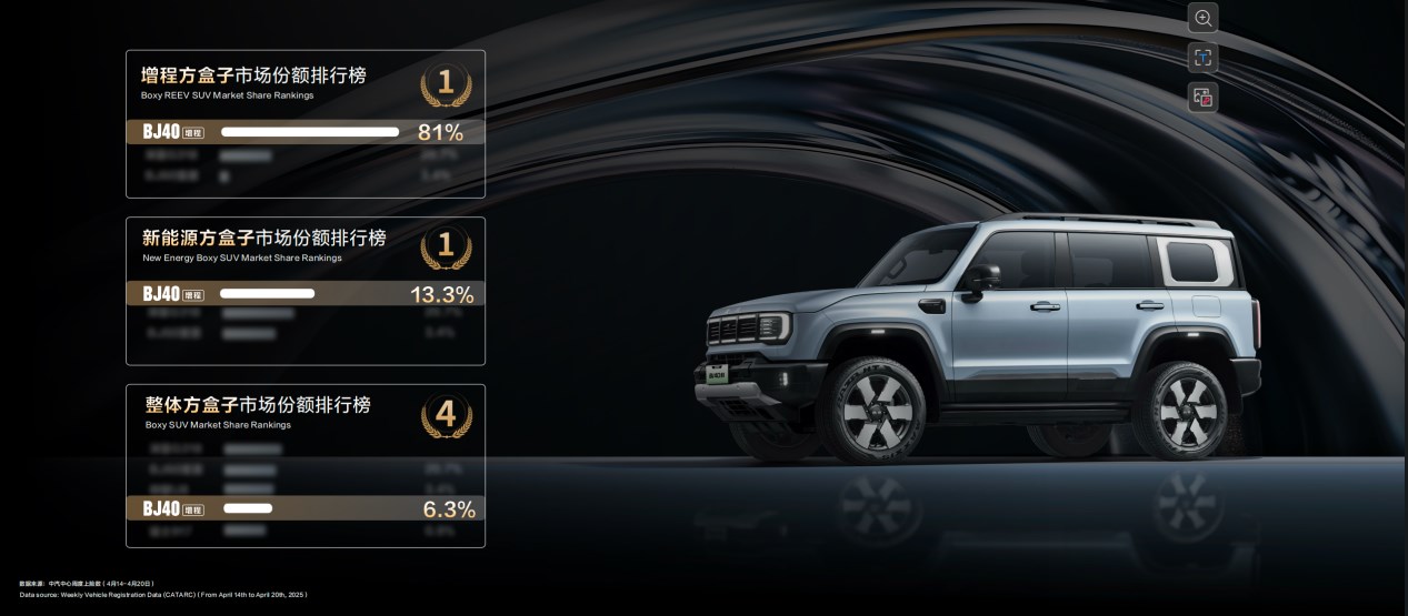 BJ40增程既能城市通勤非常省油、又能周末戶外肆意馳騁,發(fā)布會(huì)后1小時(shí)訂單量就突破了3000臺(tái),48小時(shí)突破了1萬(wàn)臺(tái)。根據(jù)中汽中心周度上險(xiǎn)數(shù)顯示,在增程方盒子排行榜上,BJ40增程上周市場(chǎng)份額達(dá)到81%;在新能源方盒子市場(chǎng),排名第一;在整體方盒子市場(chǎng)中,排名第四。這是用戶對(duì)北京越野“做增程方盒子之王”的信任投票。
