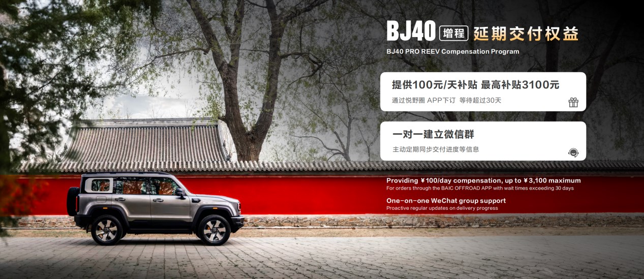 短時(shí)間大量訂單涌入,市場(chǎng)上存在部分車輛訂單延遲交付。北京越野發(fā)布“BJ40增程延期交付權(quán)益”,用戶在悅野圈 APP 下訂后,車輛等待時(shí)間超過(guò) 30 天后給予 100 元/天補(bǔ)貼,最高補(bǔ)貼 3100 元,補(bǔ)貼將在悅野圈 APP 以“積分”形式兌現(xiàn)給用戶。同時(shí),北京越野將與用戶一對(duì)一建立微信群,主動(dòng)定期同步車輛生產(chǎn)下線進(jìn)度、物流發(fā)運(yùn)進(jìn)度及預(yù)計(jì)交車時(shí)間等,讓用戶的期待離實(shí)現(xiàn)越來(lái)越近。