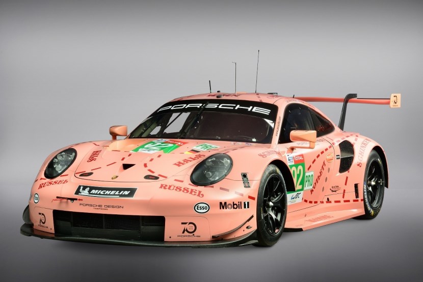 毫無(wú)疑問(wèn),這是一款現(xiàn)代化的賽車——911 RSR(991),其出征了 2018 年的勒芒 24 小時(shí)耐力賽 GTE-Pro 組別的角逐。最終這臺(tái)身披“粉豬”涂裝的 92 號(hào) 911 RSR 賽車在與法拉利、寶馬、福特、克爾維特、阿斯頓·馬丁五大制造商車隊(duì)的同場(chǎng)競(jìng)技中斬獲組別冠軍。更值得一提的是,雖然未出現(xiàn)在展臺(tái),但身披樂(lè)富門涂裝的 91 號(hào)911 RSR賽車斬獲亞軍,包攬組別前兩名。這款“粉豬”涂裝的 92 號(hào) 911 RSR 賽車不由令人想起保時(shí)捷 917/20 賽車征戰(zhàn) 1971 年勒芒比賽時(shí)的情景。車身圖案為粉色豬肉切割圖的樣式,這一由保時(shí)捷設(shè)計(jì)師 Anatole Lapine 提出的設(shè)計(jì)理念在當(dāng)年的法國(guó)薩爾特省引起轟動(dòng)。時(shí)至今日,被稱做“松露獵人”的保時(shí)捷 917/20 賽車仍是最著名的保時(shí)捷賽車之一。