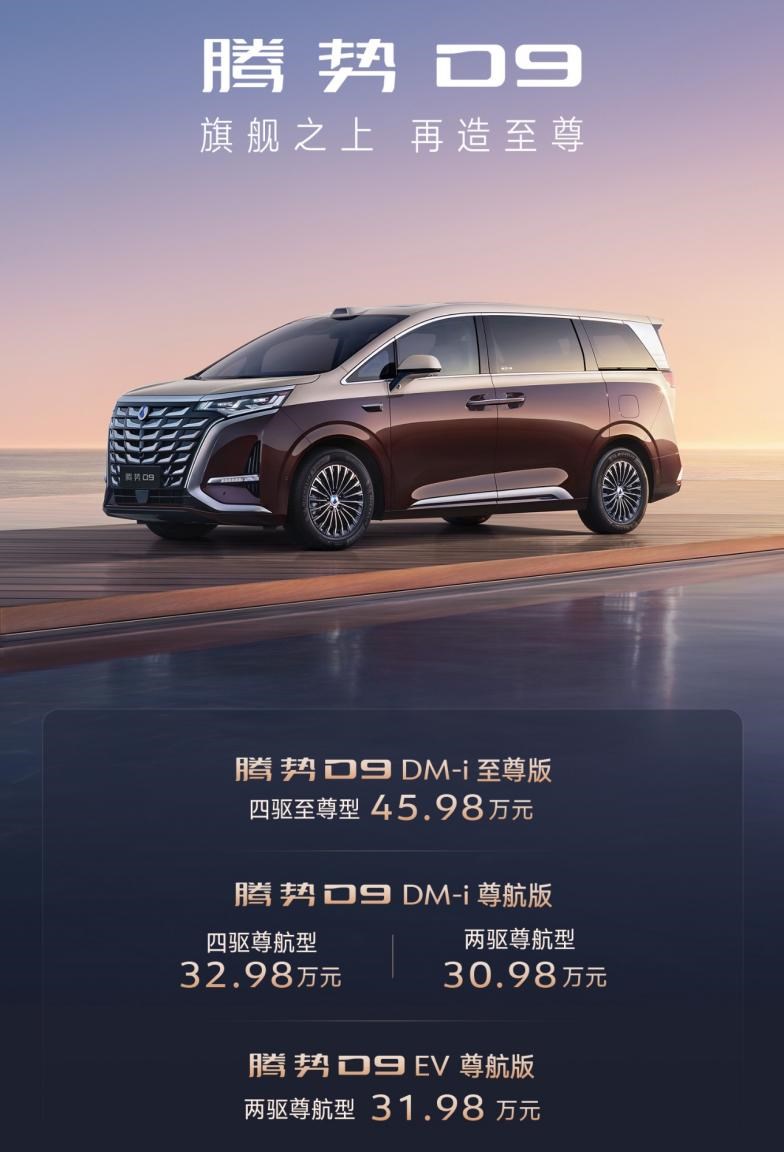 8月29日,騰勢(shì)D9新品正式上市,共推出至尊版、尊航版4款型,官方指導(dǎo)價(jià)30.98萬元起。騰勢(shì)D9新品標(biāo)配超過200項(xiàng)科技豪華配置,并在旗艦之上再造至尊,滿足用戶更加多元化的科技豪華MPV需求。