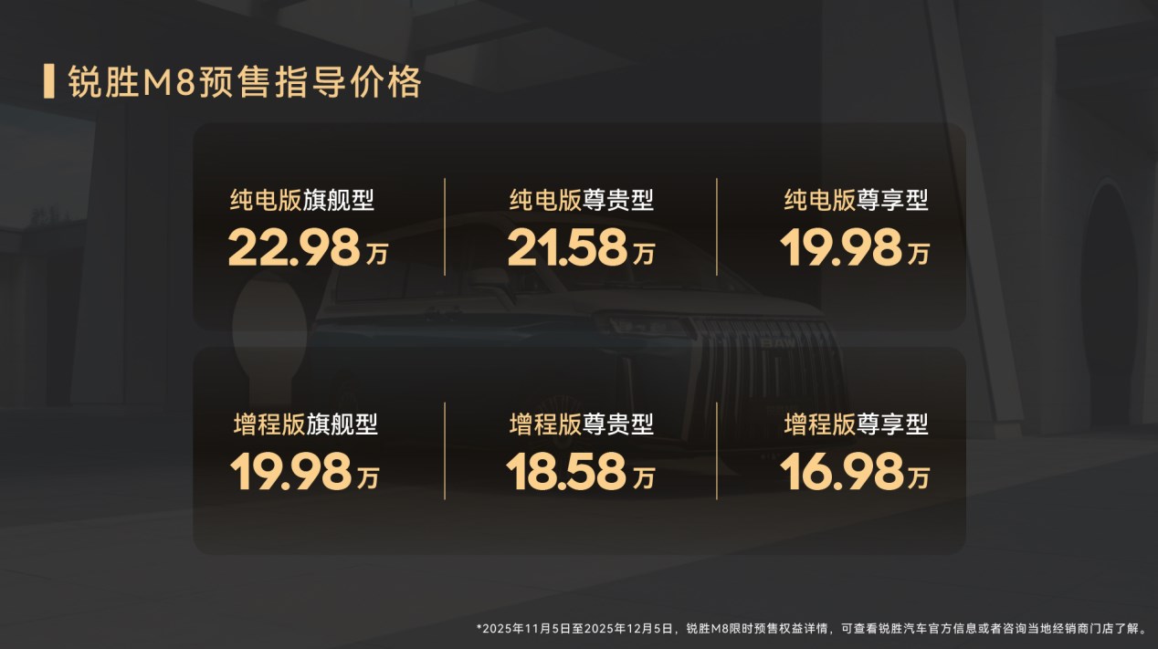 11月5日,作為北京汽車制造廠旗下專注MPV賽道的獨(dú)立品牌,銳勝汽車在青島召開(kāi)“全場(chǎng)景·才是真舒享”銳勝M(fèi)8預(yù)售發(fā)布會(huì)。銳勝M(fèi)8提供多種動(dòng)力版本,預(yù)售價(jià)格分別為:銳勝M(fèi)8-增程版169800元起,銳勝M(fèi)8-EV版199800元起。全系車型擁有多場(chǎng)景適用與經(jīng)濟(jì)實(shí)用性,兼顧越級(jí)空間及豐富配置,盡享三排都是商務(wù)艙的奢適感,給出了大型MPV高質(zhì)價(jià)比的新選擇。