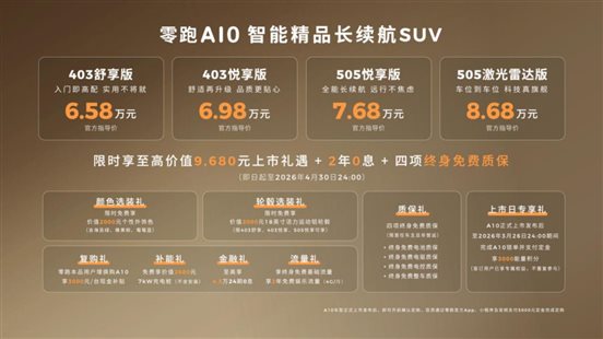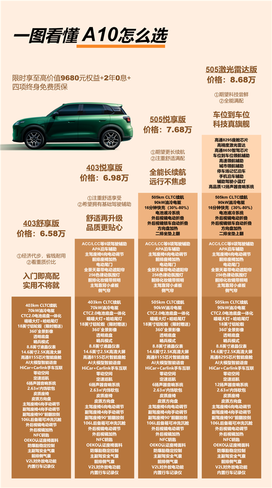 零跑 A10 一共四個(gè)版本,我給大家捋清楚每個(gè)版本的差異,直接對(duì)號(hào)入座就行: